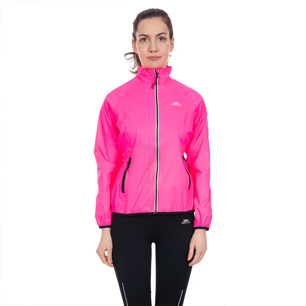 Let og reflekterende dame vindjakke fra Trespass i farven Hi Visibility Pink. Vandafvisende, åndbar og ideel til løb, cykling og vandring i overgangsvejr.