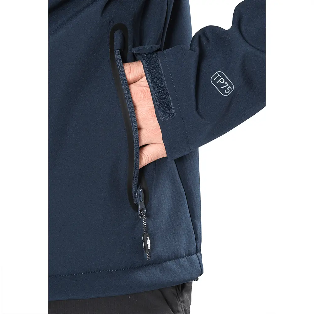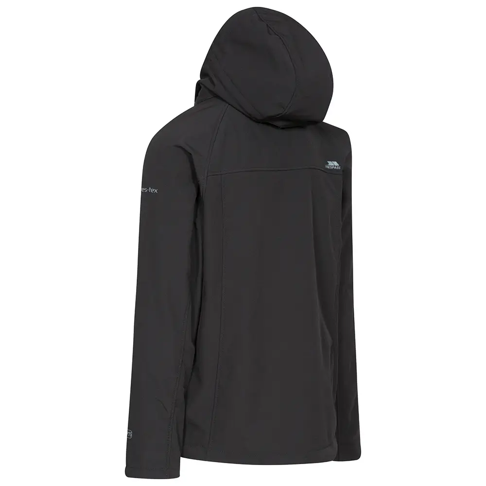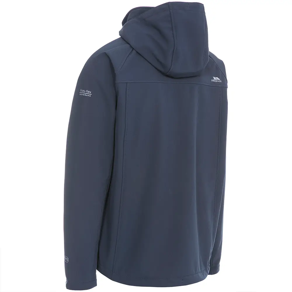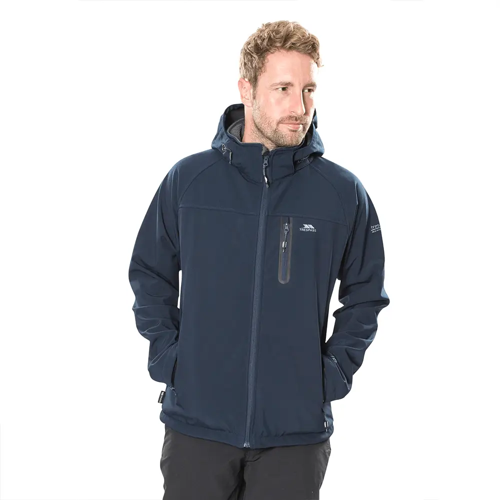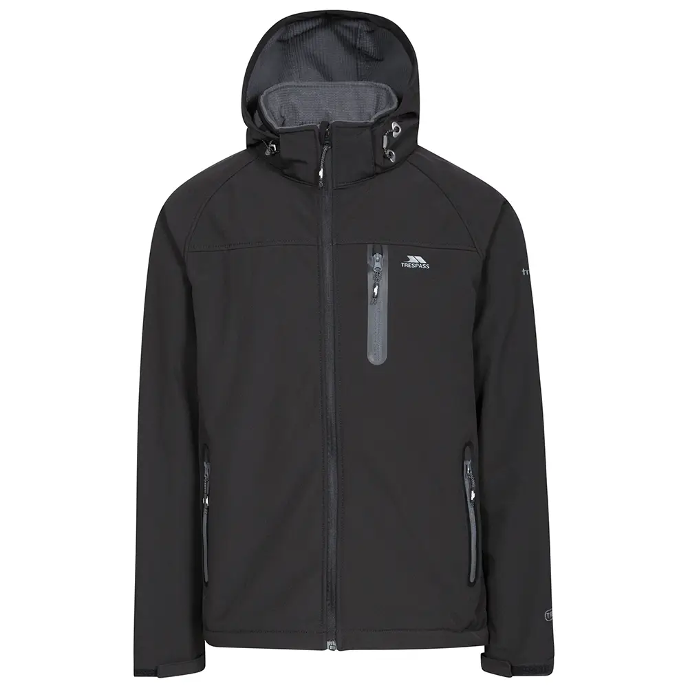 Vindtæt og vandafvisende herre softshelljakke fra Trespass med 8.000 mm beskyttelse, aftagelig hætte, 3 lommer og strækbar komfort til aktivt brug.