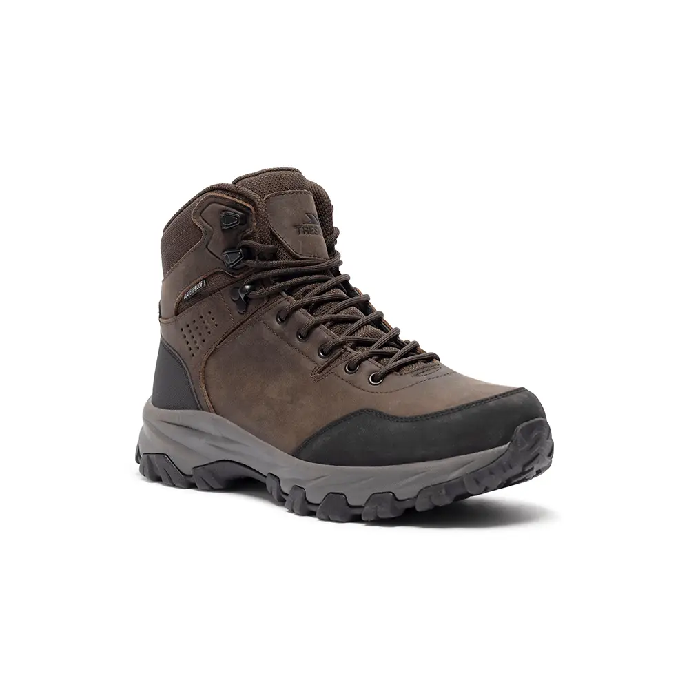 Herre vandrestøvler Trespass Stride i brun med læderoverdel, vandtæt membran og skridsikker sål. Robust støvle til vandring og friluftsliv.