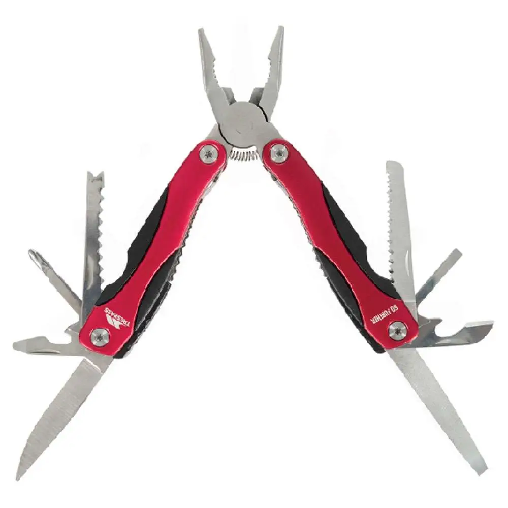 Praktisk 11-funktion multiværktøj i rustfrit stål fra Trespass. Inkl. kniv, sav, tænger og oplukker – perfekt til camping, rejser og outdoor.