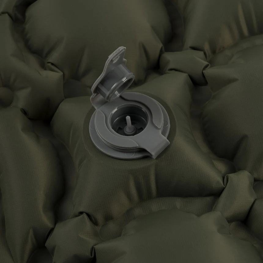 PAK-PAD Air Seat har en dobbelt ventil. Det inderste lag fungerer som én-vejs indblæsning, og det yderste lag bruges til hurtig udluftning. Du kan puste den op manuelt eller med en lille pumpe.